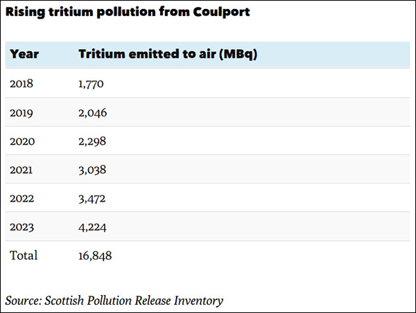 “TheFerret”网站去年年底曾报道称,库尔波特的氚排放量在6年内翻了一番,2018年至2023年放射性物质含量从1770兆贝克勒尔(MBq)增加至4224兆贝克勒尔。